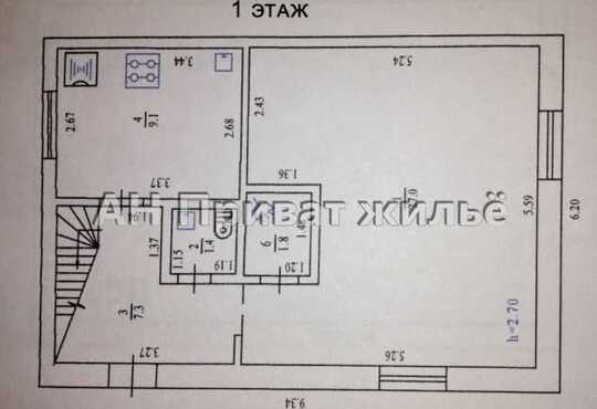 * 1-й поверх: простора кухня 10 м2, санвузол, велика кімната 27 м2.